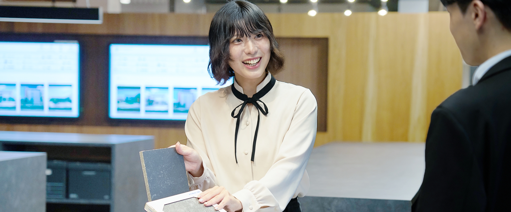 さらに、面接でオフィスを訪れた際、活気あふれる雰囲気に心を奪われたんです。お客様と営業担当者が笑顔で談笑し、設計担当者が真剣な眼差しで図面に向かい、インテリアコーディネーターが楽しそうに素材サンプルを選んでいる。誰もが自分の仕事に誇りを持ち、お客様は本当に楽しそうに打ち合わせをし、イキイキとしている様子が、空間全体からひしひしと伝わってきました。