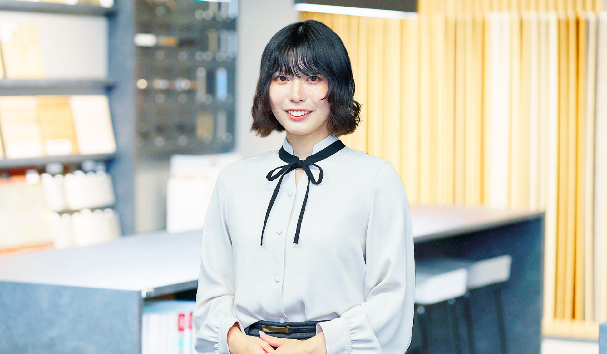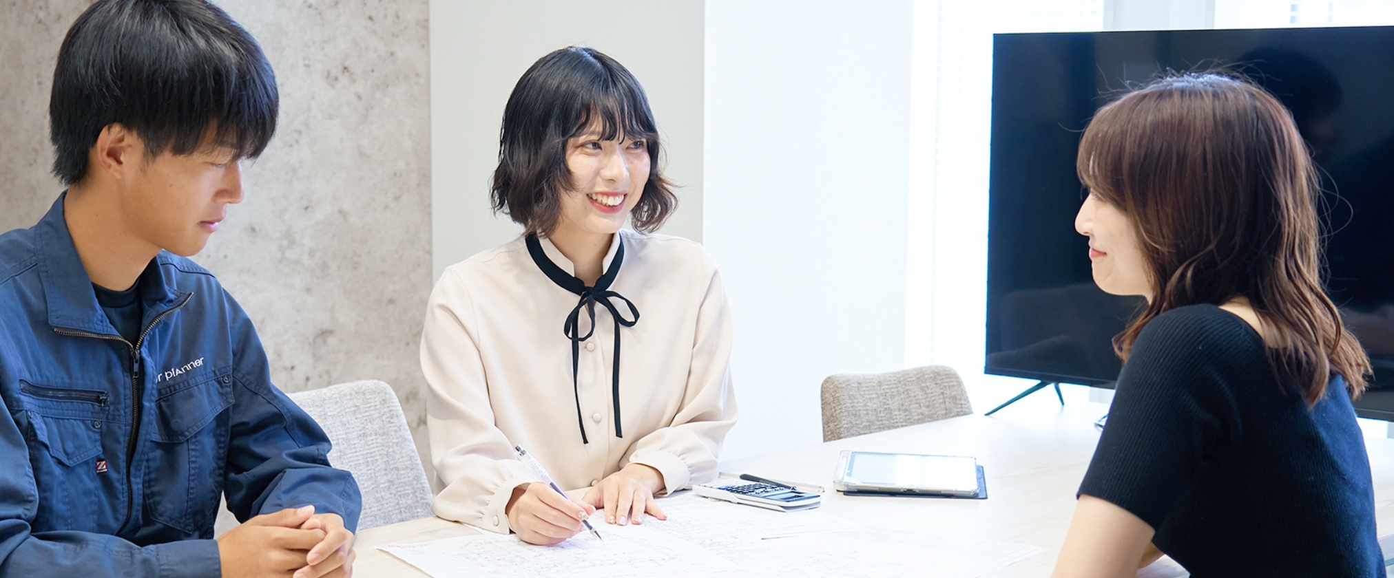 さらに、面接でオフィスを訪れた際、活気あふれる雰囲気に心を奪われたんです。お客様と営業担当者が笑顔で談笑し、設計担当者が真剣な眼差しで図面に向かい、インテリアコーディネーターが楽しそうに素材サンプルを選んでいる。誰もが自分の仕事に誇りを持ち、お客様は本当に楽しそうに打ち合わせをし、イキイキとしている様子が、空間全体からひしひしと伝わってきました。